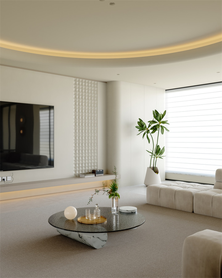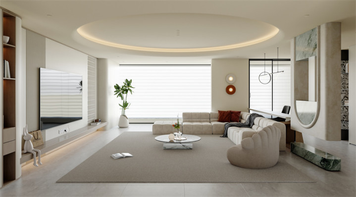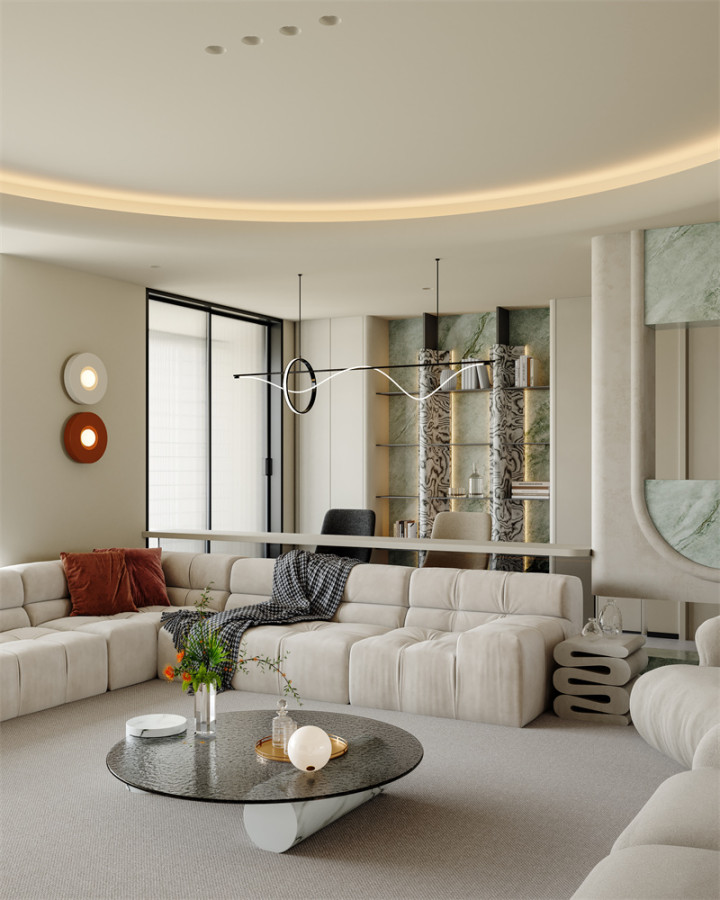 弧形吊顶藏着一圈光晕,像给空间盖了层软乎乎的“被子”。L 型沙发是奶 fufu 的模块式测度打算,坐上去像陷进蓬松的云朵里;独揽那把贝壳造型的单东谈主椅,连扶手齐带着高昂的弧度,唾手搭个格纹毯,慵懒感平直拉满。
