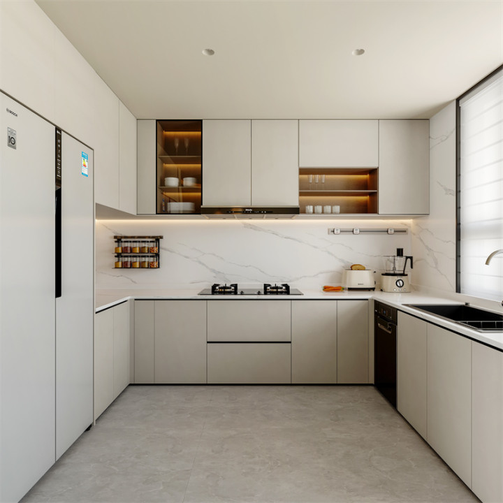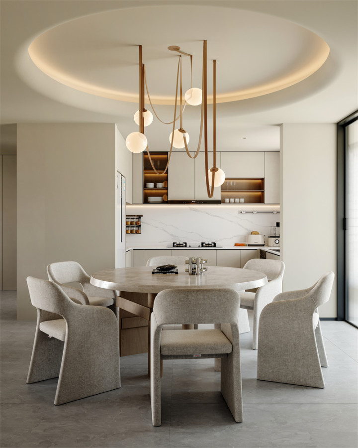 餐厅和厨房是“无缝承接” 的和煦场。圆餐桌配着包裹感齐全的布艺餐椅,头顶的球形吊灯像悬着几颗发光的奶糖;独揽的绽开式厨房藏着预防想 —— 白色柜面衬着大理石纹墙砖,内嵌柜里的暖光把餐具齐照得和煦,哪怕是洗个碗,齐像在给生涯作念 “柔光滤镜”。